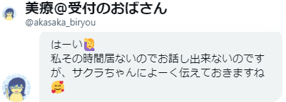 Twitterで様々なお店の方にフォローしていただくのですが、赤坂美療の受付のお姉さまは、特にホスピタリティの高いコメントをしてくださる方で、以前からずっと気になっていました。